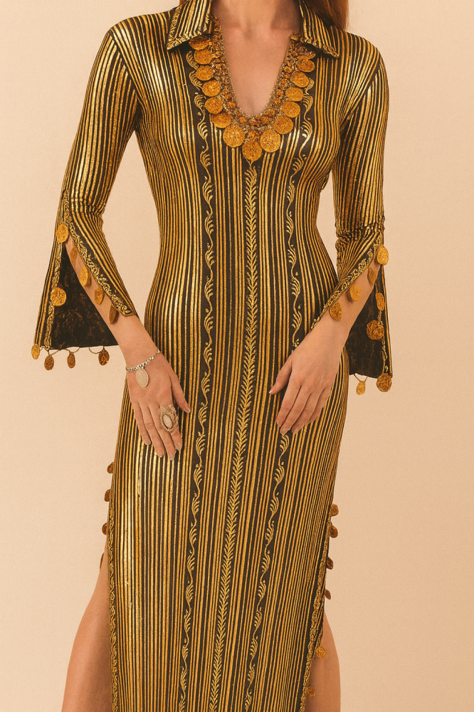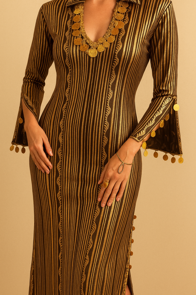 بدلة رقص أنيقة بتصميم شرقي أصيل بخطوط لامعة طولية باللونين الأسود والفضي، ما يمنحها إطلالة بارزة وجذابة. يتميز الموديل بياقة مفتوحة مع تطريزات معدنية لامعة وأقراص فضية متدلية عند الصدر والأكمام، تضيف لمسة أنثوية مميزة. الأكمام الواسعة المفتوحة مع الحليات المعدنية تمنح الحركة مزيدًا من الجاذبية، فيما يضفي الشق الجانبي لمسة مثيرة تعكس أنوثة راقية.