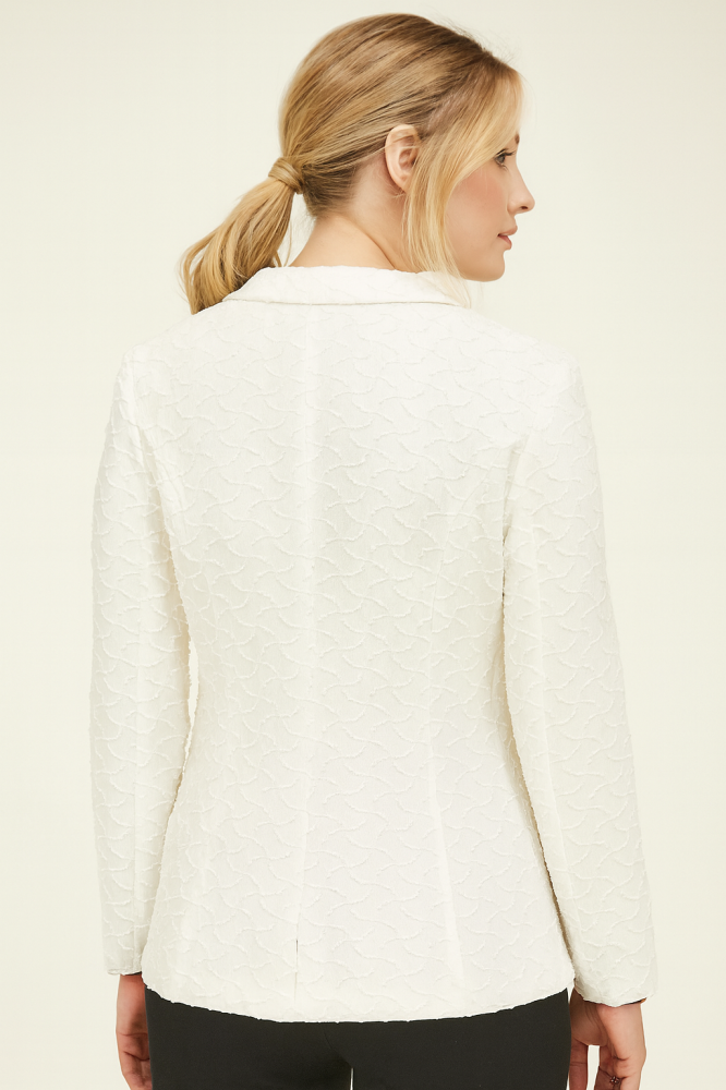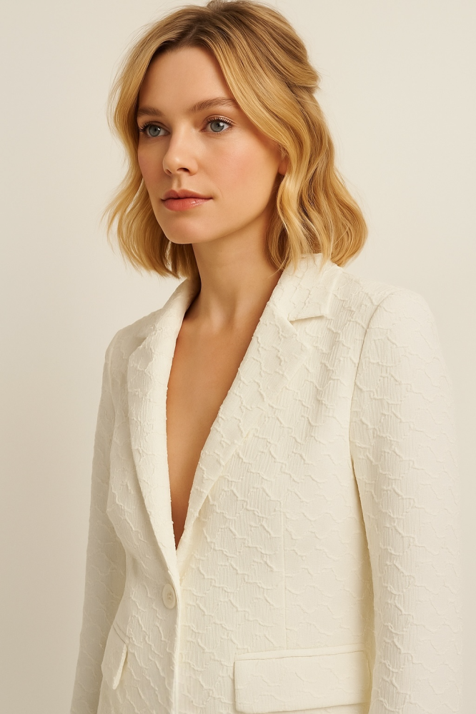 بليزر نسائي فاخر باللون الأبيض مصمم بخامة منقوشة بنعومة تضيف لمسة راقية للإطلالة. يأتي بقصة كلاسيكية أنثوية مع ياقة عريضة وأزرار أمامية لإغلاق أنيق، بالإضافة إلى جيوب أمامية بغطاء تمنحه لمسة عملية وعصرية. قطعة مثالية للتنسيق مع البناطيل أو التنانير لإطلالة مكتبية أو رسمية أنيقة.