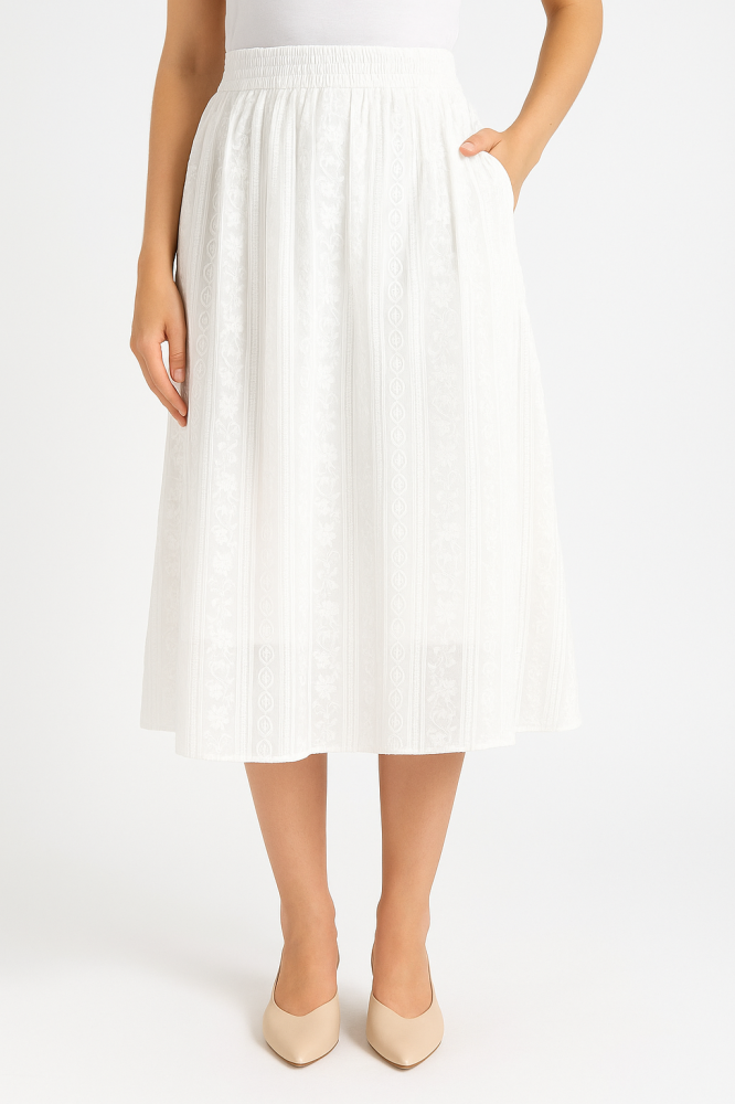 تنورة بيضاء ميدي بقماش مطرز ناعم