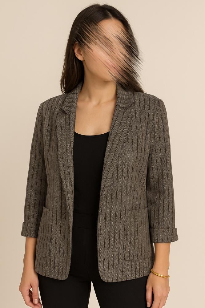 جاكيت رسمي نسائي بتصميم كلاسيكي أنيق، يتميز بخطوط طولية ناعمة تمنحه مظهرًا عصريًا ومناسبًا للإطلالات العملية أو الرسمية. يأتي بقصة مستقيمة وأكمام قابلة للطي، مع ياقة رسمية وجيوب أمامية عملية تضيف لمسة من الأناقة والعملية في آنٍ واحد.