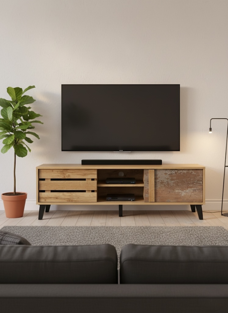 طاولة تلفزيون بتصميم ماليزي عصري تجمع بين الأناقة العملية واللمسة الريفية الحديثة.