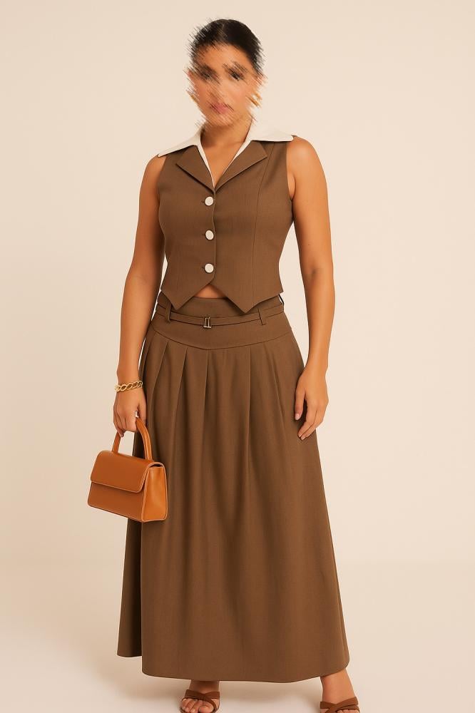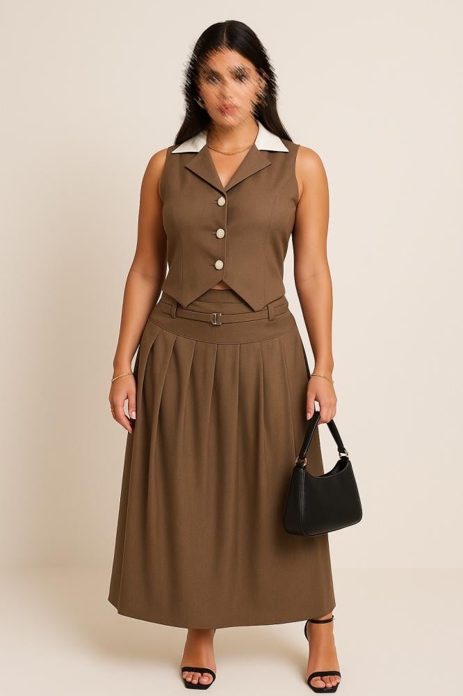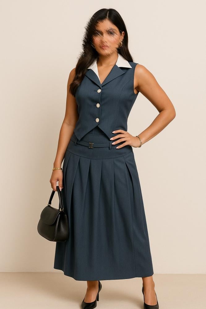 طقم نسائي رسمي فاخر يتكون من توب بلا أكمام بأزرار أمامية مع ياقة كلاسيكية بلون أبيض تضفي لمسة مميزة، بالإضافة إلى تنورة طويلة بطيّات ناعمة وحزام خصر بنفس القماش يمنح إطلالة متوازنة بين الأناقة والراحة. التصميم انسيابي وعملي يناسب الإطلالات الرسمية والعملية، ويمكن تنسيقه بسهولة مع حقائب وأحذية بألوان محايدة لإكمال الطلة.