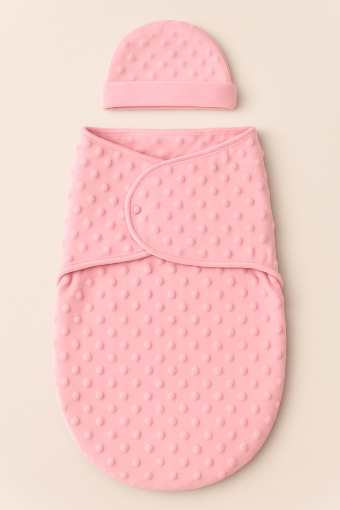 طقم مواليد ناعم وأنيق باللون الوردي الفاتح، يتكوّن من قبعة مطابقة وكوفلة بتصميم مغلق. يتميز القماش بنقشة بارزة تمنح ملمسًا محببًا ومظهرًا لطيفًا. مناسب لتدفئة الطفل في الأيام الباردة، مع لمسة أنثوية مميزة تليق بأناقة المواليد البنات.