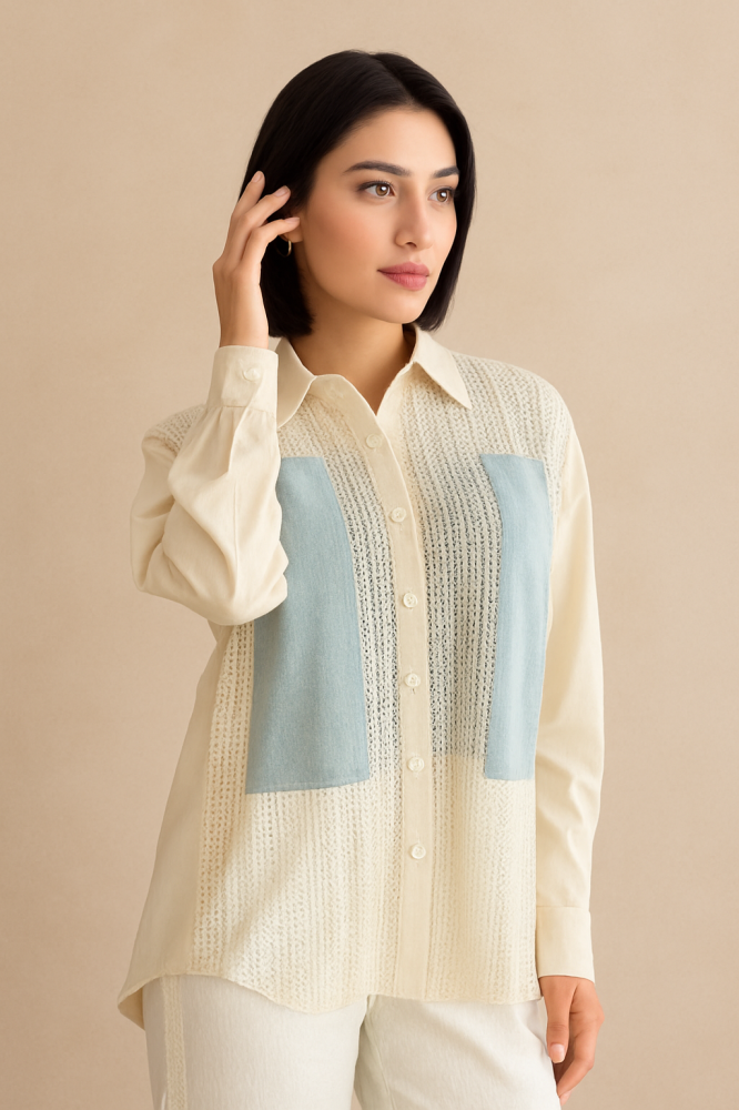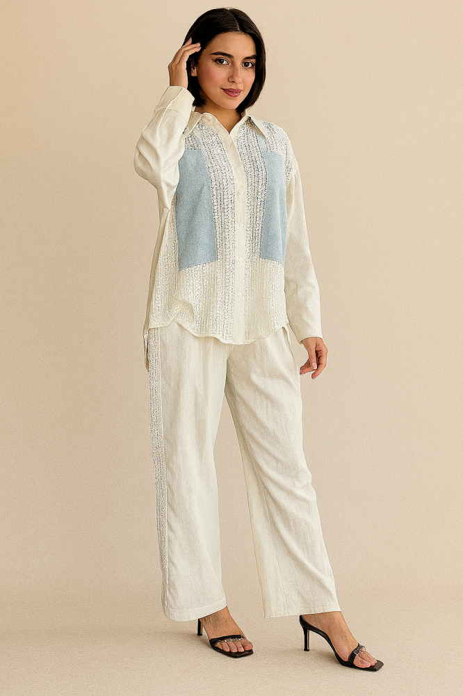 طقم نسائي ناعم ومريح يتكوّن من قميص طويل بأزرار وبنطال واسع بنفس اللون السكري الفاتح. يتميز القميص بتفاصيل شبكية أنيقة من الأمام وإضافات قماشية بلون أزرق باودر على الجانبين تضيف لمسة فنية راقية. أما البنطال، فيأتي بقصّة مستقيمة وانسيابية مع شريط زخرفي جانبي متناغم مع تفاصيل القميص.