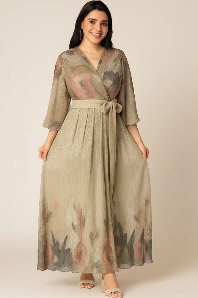 فستان بطبعات ناعمة وقصة لف مع حزام