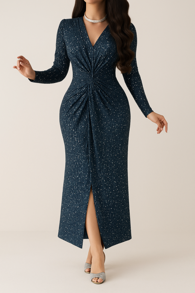 فستان سهرة فاخر بتصميم طويل ضيق يبرز جمال القوام برقي. يتميز بقصة ملتفة عند الخصر تمنح شكلاً انسيابياً أنثوياً مع فتحة أمامية أنيقة تضيف لمسة جاذبية. الأكمام الطويلة والياقة على شكل V تمنح الفستان إطلالة راقية مثالية للمناسبات الرسمية والاحتفالات. قماشه مزدان بلمسات لامعة ناعمة تضفي عليه فخامة وأناقة إضافية.
