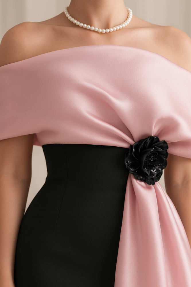 تألقي بإطلالة فاخرة لا تُنسى مع هذا الفستان الأسود الأنيق المزين بتفاصيل ساتان وردية ناعمة تنسدل من الكتف وتزين الخصر بوردة سوداء فخمة. التصميم الأوف شولدر مع القصة الطويلة الضيقة يبرز أنوثتك بأسلوب راقٍ، ويضفي لمسة درامية متقنة تجمع بين النعومة والرقي.