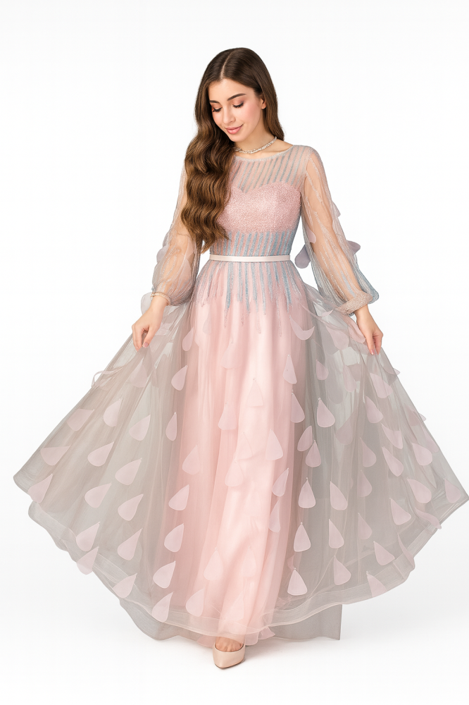 فستان سهرة فاخر يجمع بين النعومة والفخامة في تصميم واحد أنثوي وأنيق. يتميز بطبقة شفافة من التول الناعم المزينة بأشكال هندسية منسدلة تمنحه حركة ساحرة. صدر الفستان مطرز بخيوط لامعة تضيف لمسة راقية، فيما يحيط الخصر بحزام ناعم يبرز جمال القوام. الأكمام الواسعة الشفافة تضيف لمسة ملكية فريدة تجعل الفستان خياراً مثالياً للمناسبات المميزة.