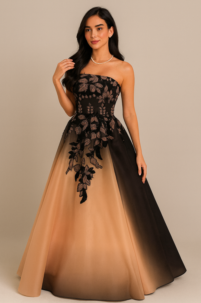 فستان سهرة أنيق يأتي بتصميم منفوش بدون أكمام، بستايل الـ"سترابلس"، يعكس أنوثة راقية وحضور ملكي. الجزء العلوي مصنوع من قماش أسود مزين بتطريزات أوراق لامعة تمتد بنعومة على التنورة، التي تنساب بتدرج ساحر من الأسود إلى البيج. تصميم فخم يلفت الأنظار بجمال تفاصيله وتناسق ألوانه، مثالي للمناسبات الفاخرة والسهرات الراقية.