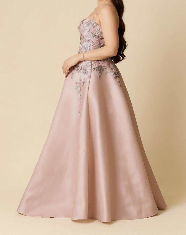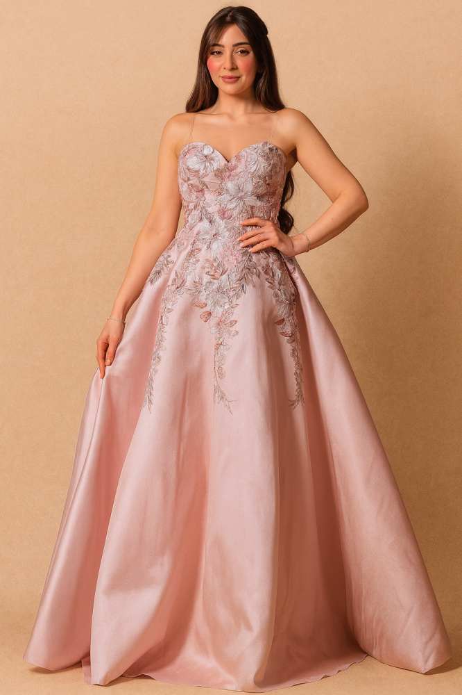 إطلالة ملكية ساحرة تنتظرك مع هذا الفستان الوردي المنفوش المصمم بقماش لامع وتطريزات زهرية دقيقة تغطي الصدر وتنحدر بانسيابية على التنورة. يتميز بقصة صدر مكشوف على شكل قلب مع حمالات شفافة بالكاد تُرى، تضيف لمسة أنثوية ناعمة. الفستان يأتي بقصة منفوشة من الأسفل تمنحك حضورًا ملفتًا يناسب أجواء السهرات الفاخرة والمناسبات الكبيرة.