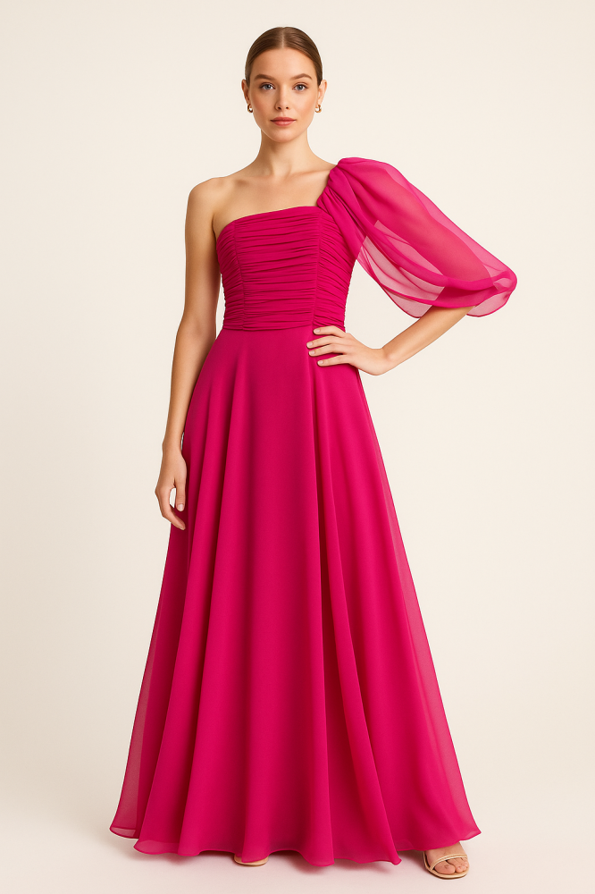وصف المنتج: فستان سهرة فاخر بلون فوشي لافت، بتصميم أنيق بكتف واحد يضفي لمسة عصرية جريئة. يتميز بكم منفوش من الشيفون الشفاف يمنح توازنًا مثاليًا بين ال...