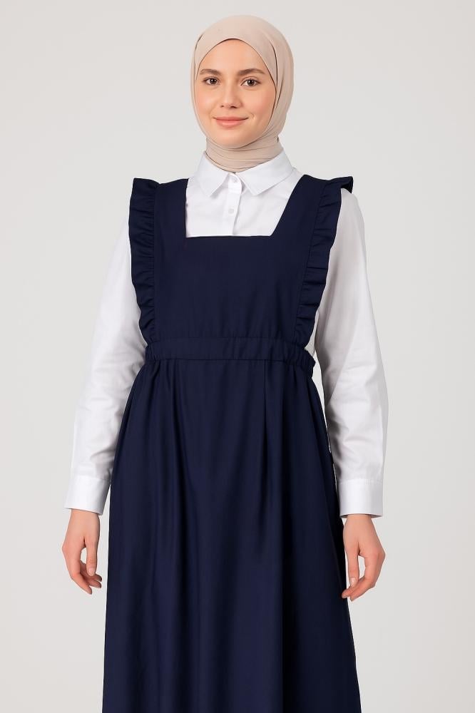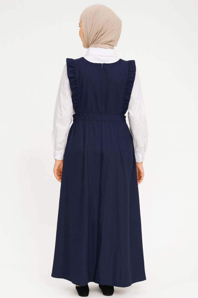 مريول مدرسي كحلي بكتف مكشكش للبنات - تصميم أنيق للمرحلة المتوسطة مع القميص الأبيض